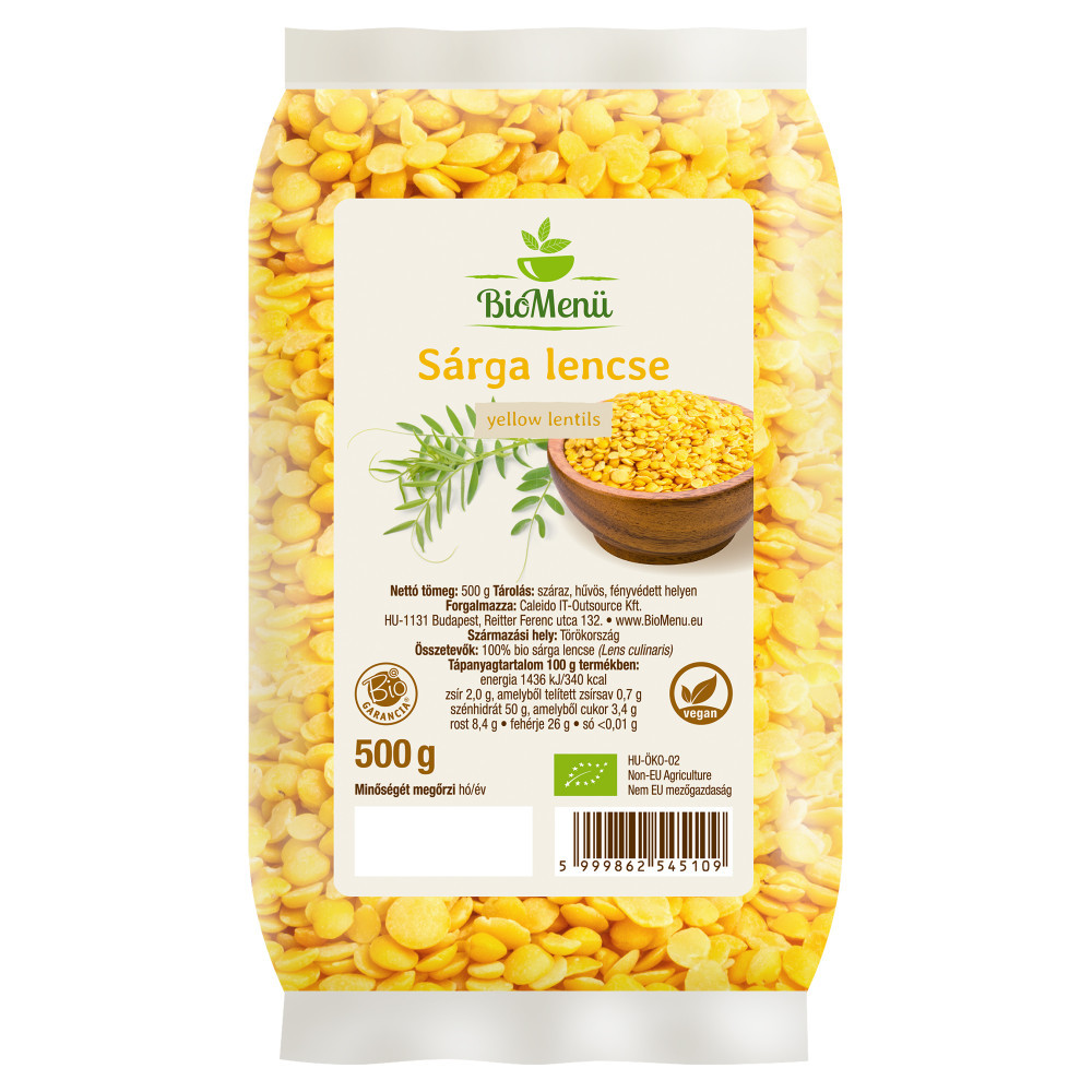 100% bio sárga lencse (Lens culinaris); Allergének: nyomokban glutént, szóját és szezámmagot tartalmazhat