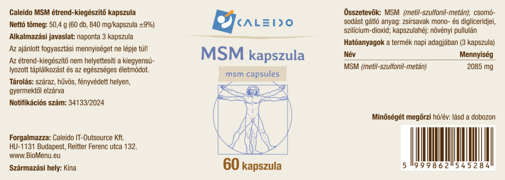 MSM (metil-szulfonil-metán); csomósodást gátló anyag: zsírsavak mono- és digliceridjei, szilícium-dioxid; kapszulahéj: növényi pullulán