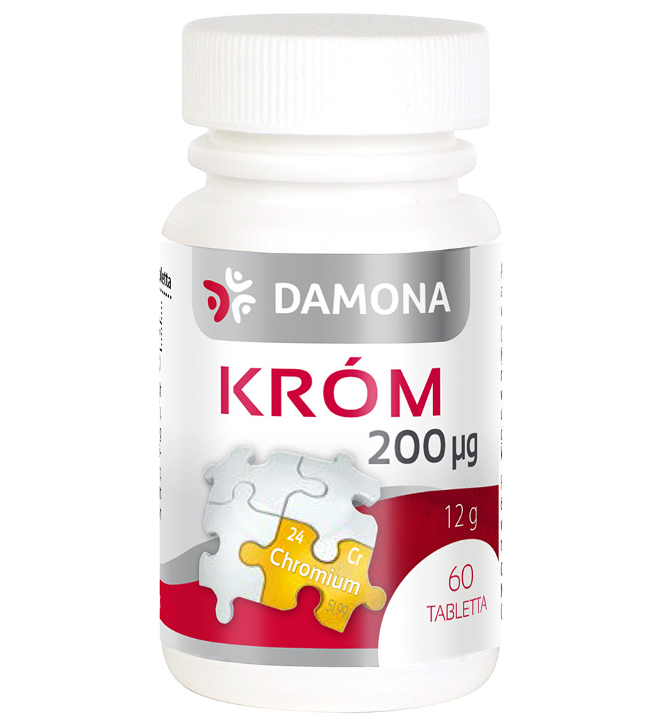 A Damona Króm 200 µg 60x étrend-kiegészítő tabletta 200 µg krómot tartalmaz tablettánként. A króm részt vesz a makrotápanyagok normál anyagcseréjében és hozzájárul a normál vércukorszint fenntartásához.