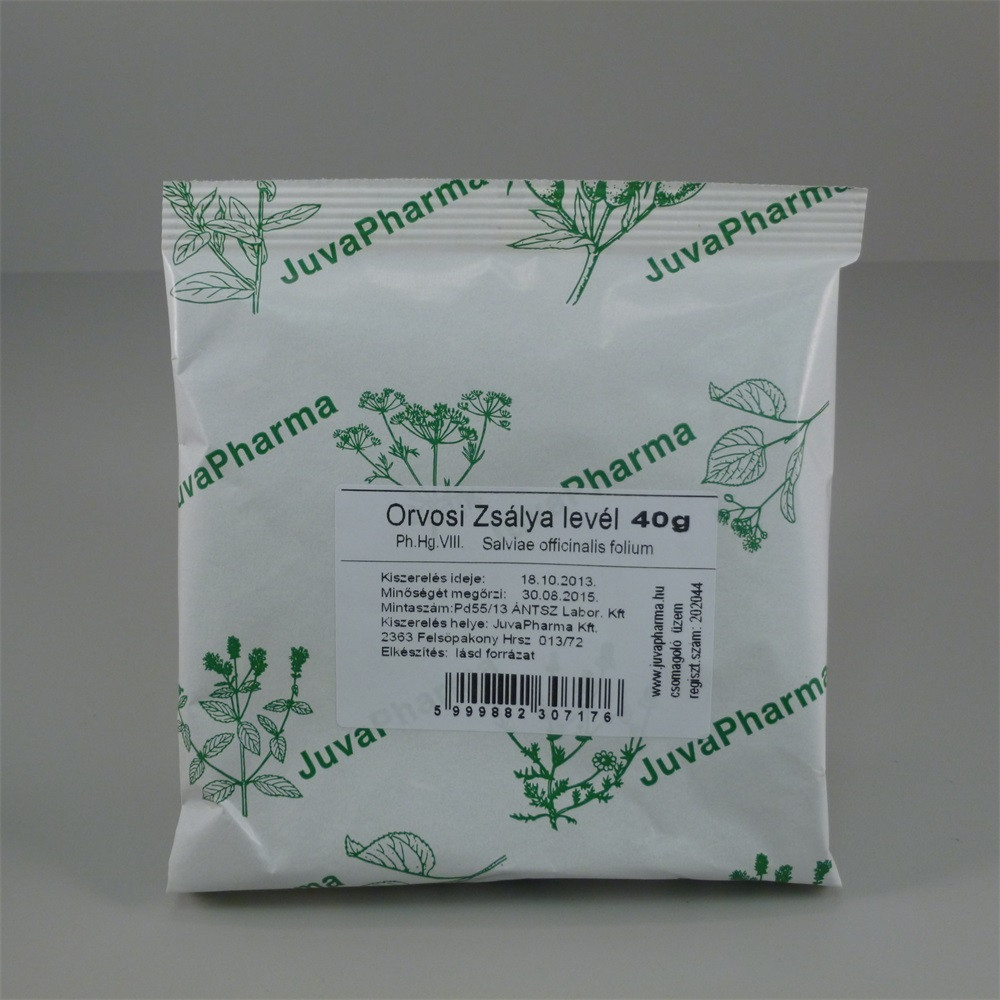 JUVAPHARMA ORVOSI ZSÁLYA LEVÉL TEA A Juvapharma orvosi zsálya levél tea gyulladás- és izzadáscsökkentő hatással rendelkezik. Ismeretes a verejtékképződést szabályozó hatása is. Ajánlják fogínygyulladás, száj- és garatnyálkahártya-gyulladása elleni öblögető szerként. A Juvapharma orvosi zsálya levél tea légzőszervi megbetegedésekre az egyik legjobb gyógynövény.Belsőleg történő használata felfúvódás, emésztési zavarok kezelésére ajánlott. Étkezések előtt történő fogyasztásával a teltségérzettel járó emésztési panaszok megelőzésére alkalamas lehet .