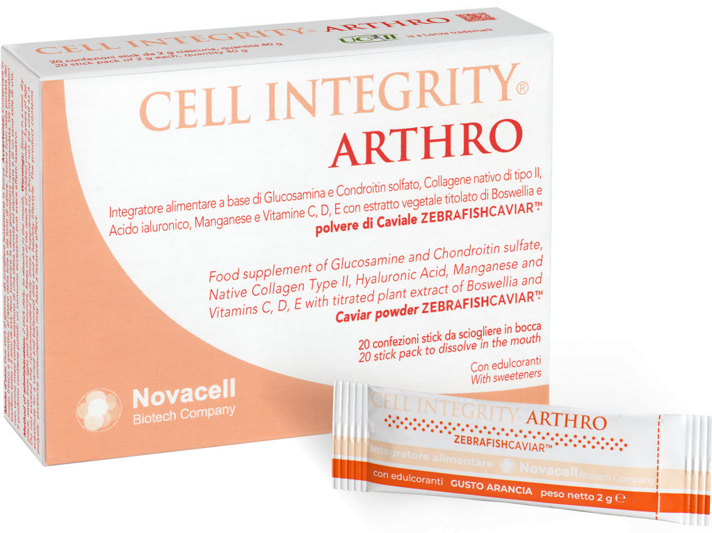 A Cell Integrity Arthro olyan segédanyagokat tartalmaz, mint a ZEBRAFISHCAVIARTM kaviárpor és natív UC-II kollagén. Ez tehát egy olyan formula, amelyet kifejezetten arra terveztek, hogy elősegítse a degenerált ízületi kollagén eltávolítását és pótlását az ízületek integritásának és mobilitásának helyreállításával, a kifejlesztett regeneratív faktorok segítségével fiziológiás módon újratermelődött kollagénnel.