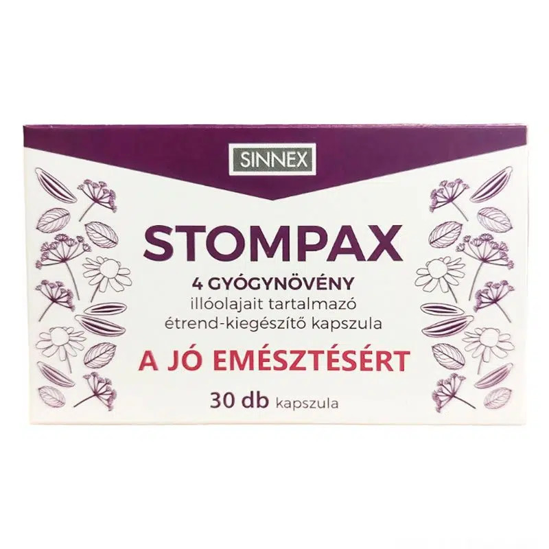Stompax 4 GYÓGYNÖVÉNY illóolajait tartalmazó étrendkiegészítő kapszula Összetevők:szorbit,hipromellóz(Hidroxipropil-metil-cellulóz),magnézium-sztearát,édeskömény olaj(Aetheroleum foeniculi), kömény olaj(Aetheroleum carvi), menta olaj(Aetheroleum menthae piperitae), gellángumi, kamilla olaj(Aetheroleum chamomillae), kolloid szilícium-dioxid