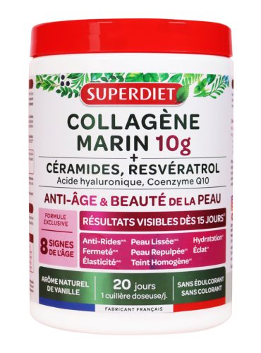 A kollagén hozzájárul a bőr feszességéhez és rugalmasságához. Segít csökkenteni a ráncokat és barázdákat, miközben ragyogóbbá és egységesebbé teszi a bőrt. A SUPERDIET 10 g hidrolizált tengeri kollagént (NATICOL® type I és II) tartalmaz, amely alacsony molekulatömegének köszönhetően kiválóan hasznosul.