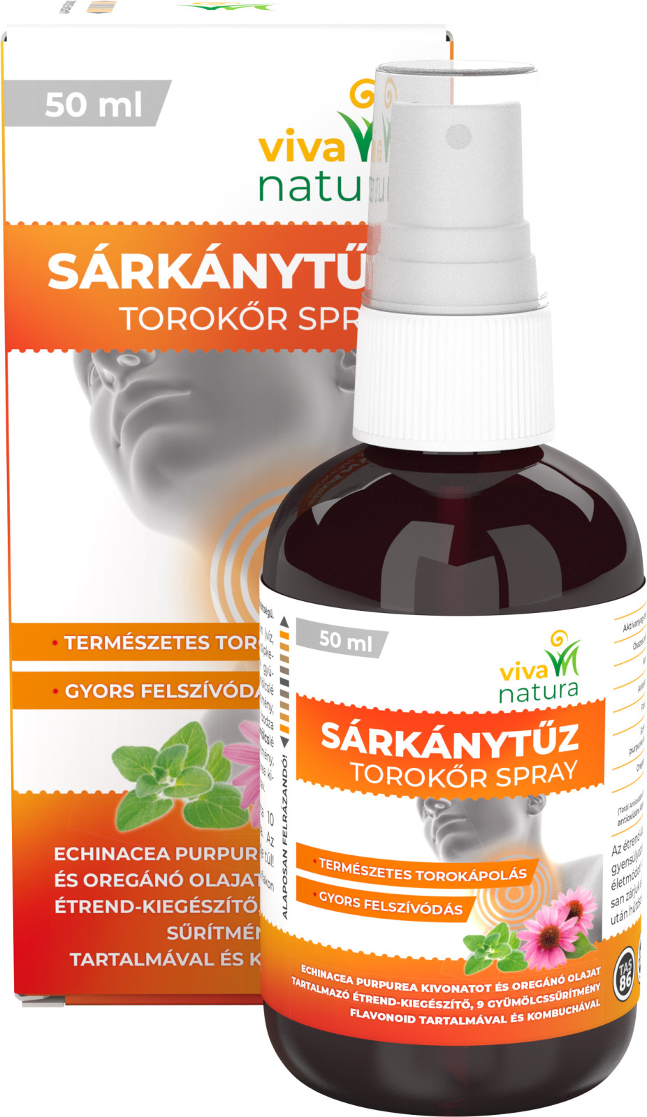 Sárkánytűz Torokőr Spray – Echinacea Purpurea kivonatot és oregánó olajat tartalmazó étrend-kiegészítő, 9 gyümölcssűrítmény flavonoid tartalmával és kombuchával