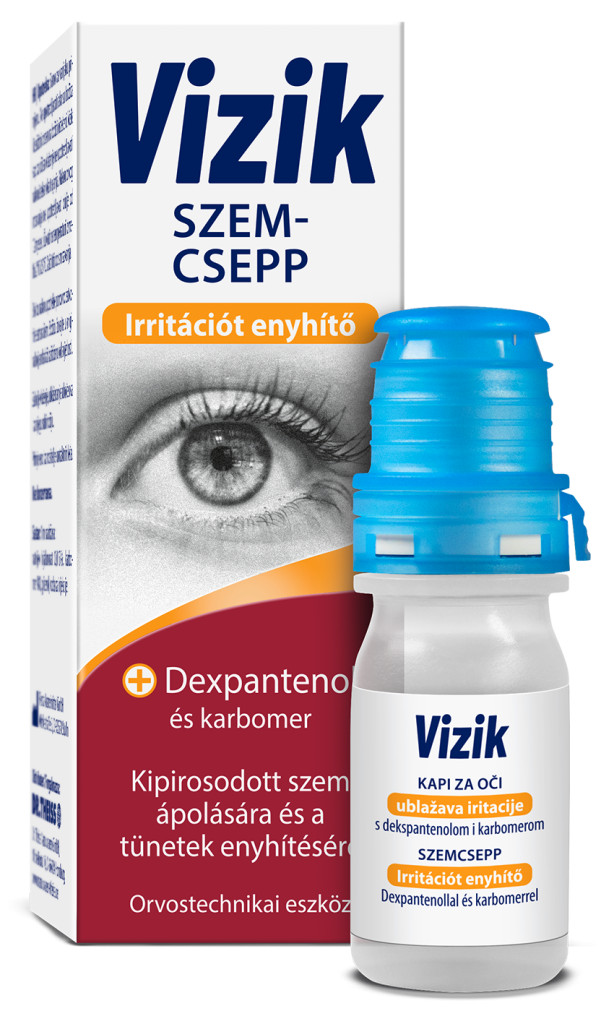 A Vizik Irritációt enyhítő szemcsepp egy steril, tartósítószer-mentes, viszkoelasztikus és átlátszó védőfilmet képez a szaruhártyán. Ezt főleg a B5-provitamin (dexpantenol) biztosítja, mely a magas vízmegkötő képessége miatt olyan tulajdonsággal rendelkezik, mely nedvesíti és ezenkívül ápolja a szemet. A dexpantenol nedvesítő tulajdonságát a karbomer összetevő támogatja. Ez egy sikosító- és védőfilmet képez a szaru- és kötőhártyán, és ezáltal kompenzálja a hiányzó könnyfolyadékot. A Vizik Irritációt enyhítő szemcsepp védi és nedvesíti a szem felületét és síkossá teszi azt. Ezáltal hosszantartó enyhülést eredményez olyan panaszok esetén, mint